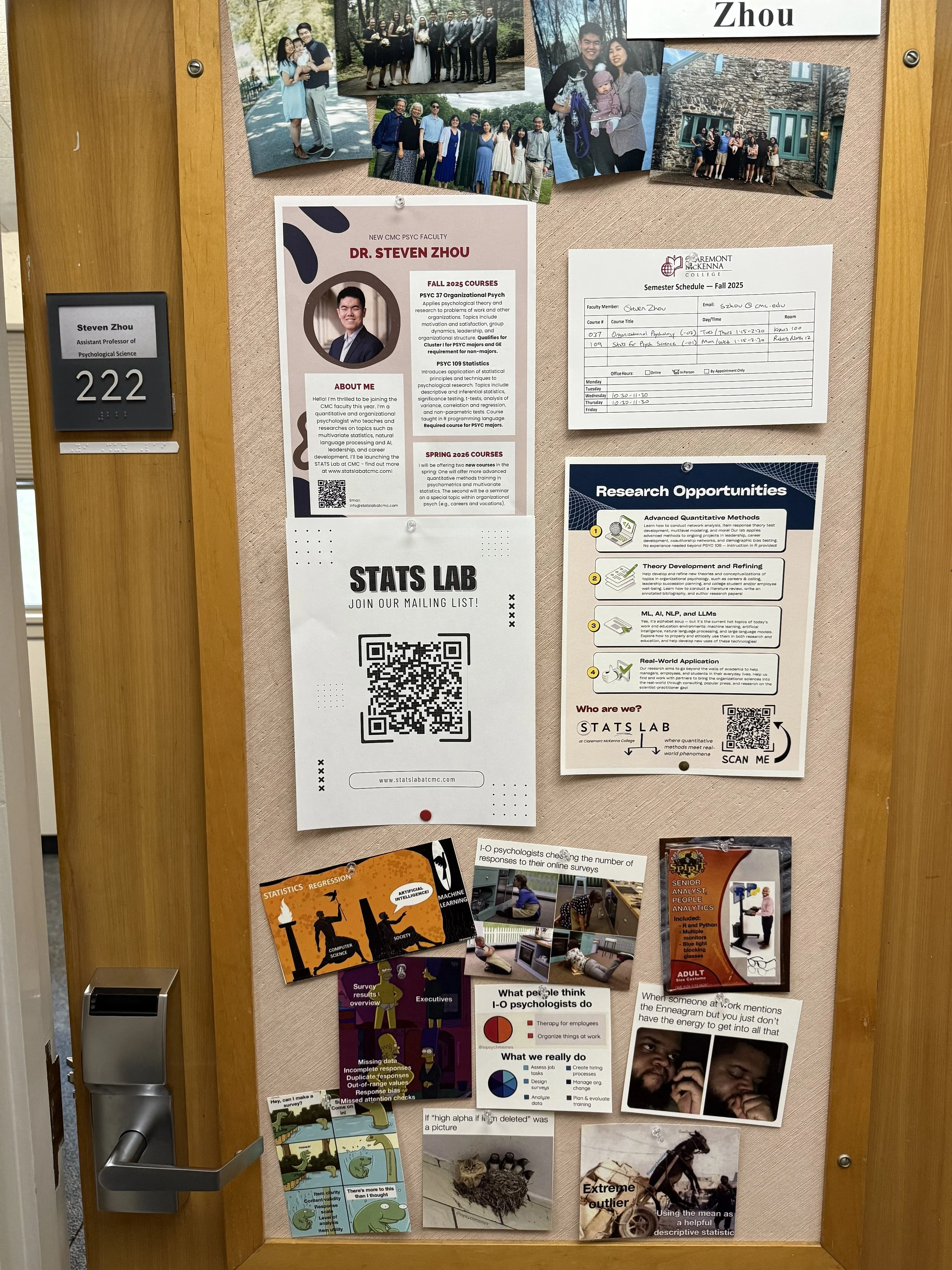 For me, the door metaphor runs deep. Liberal arts education opened the first one. Graduate school opened the next. Research has kept opening doors I didn’t even know existed. And now, here at CMC, my literal door — covered in memes, flyers, and QR codes — is open too. I hope students will step through, whether to talk about research, grab a flyer, or just laugh at a joke about regression analysis.